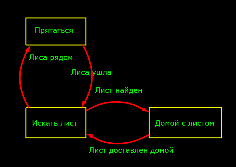Реализация конечного автомата начинается с определения его состояний и переходов между ними. Представьте себе конечный автомат, описывающий действия муравья, несущего листья в муравейник. Отправной точкой является состояние "искать лист", которое остается активным до тех пор, пока муравей не найдет лист. Когда это произойдет, состояние изменится на "домой с листом". То же самое состояние будет оставаться активным до тех пор, пока наш муравей не доберется до муравейника. После этого состояние снова изменится на " искать лист". При поиске листа возможно появление лисы. Тогда переход в состояние «прятаться». Лиса ушла, возврат в «искать лист».